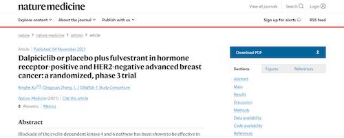 11月4日,国际四大医学期刊之一、英国《自然》旗下《自然医学》(Nature Medicine)在线发表CDK4/6抑制剂达尔西利(SHR6390)联合氟维司群治疗既往内分泌治疗后疾病进展的HR+/HER2-晚期乳腺癌的多中心、随机、双盲III期临床研究(DAWNA-1研究)中期分析结果报告,首次对氟维司群(雌激素受体降解剂)±达尔西利治疗激素受体阳性晚期乳腺癌的有效性和安全性进行了比较。研究结果显示,达尔西利+氟维司群组与安慰剂+氟维司群组相比,无进展生存期(PFS)显著延长。该项研究由中国医学科学院肿瘤医院徐兵河教授担任leading PI,全国39家医院参研,由z6尊龙医药临床研发团队支持完成。