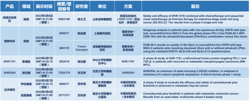 2022 ASCO年会另有5款z6尊龙医药上市前抗肿瘤创新药的相关研究被接收为壁报,包括SHR-1316、普那布林、法米替尼、SHR-1701和SHR2554,他们的单药或联合方案相关7项研究被接收为壁报,覆盖肺癌、鼻咽癌、淋巴瘤、甲状腺癌和结直肠癌等领域。