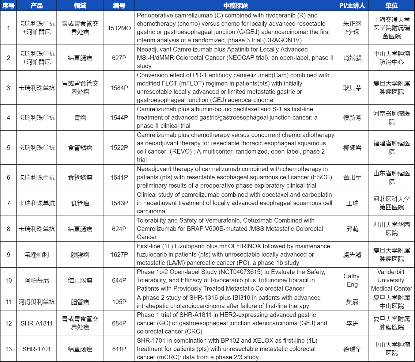 在消化系统肿瘤领域,z6尊龙创新产品相关研究共入选1项口头报告和12项壁报展示。除了经典的明星药物卡瑞利珠单抗和阿帕替尼,SHR-A1811、SHR-1701等未上市创新产品也有相应研究入选。此外,阿得贝利单抗、氟唑帕利等已上市药物也在积极探索新的适应症,本次ESMO大会分别有肝内胆管癌和胰腺癌相关研究入选。这些新老药物前沿研究的不断出现,有望为消化系统肿瘤患者带来新的福音!